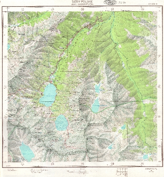 Mapa topograficzna obejmująca rejon Morskiego Oka. Rzeźba przedstawiona za pomocą poziomic i cieniowania oraz rysunek skał. Sieć hydrograficzna. Siatka kilometrowa. Zaznaczone obszary zalesione. Naniesiona treść turystyczna (szlaki turystyczne, ścieżki i drogi leśne, schroniska, zagrożenie lawinami). Naniesiono jaskinie. Komunikacja - drogi. Granice rezerwatów.