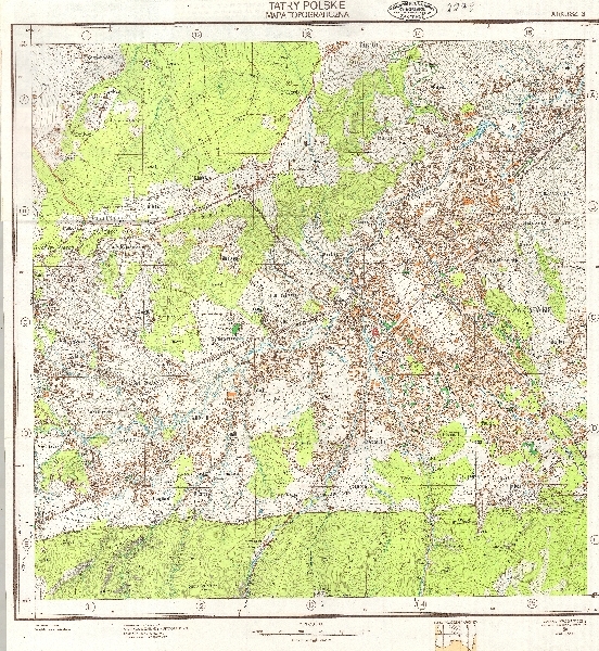 Mapa topograficzna obejmująca Zakopane. Rzeźba przedstawiona za pomocą poziomic oraz rysunek skał. Sieć hydrograficzna. Siatka kilometrowa. Zaznaczone obszary zalesione. Naniesiona treść turystyczna (szlaki turystyczne, ścieżki i drogi leśne). Naniesiono jaskinie. Komunikacja - drogi i koleje. Osadnictwo. Granice rezerwatów i granice parku narodowego.