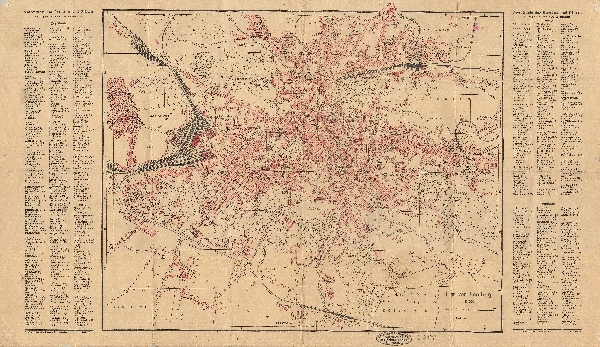 Plan Lwowa. Zaznaczono ulice, tereny zabudowane, tereny zielone. Komunikacja - koleje i autobusy. Poza ramką indeks ulic i placów.