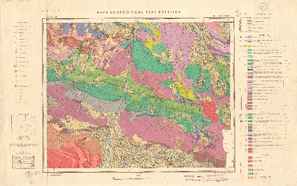 Szczegółowa mapa geologiczna, geomorfologiczna Tatr obejmująca litologię, tektonikę i stratygrafię, wykonana na podkładzie mapy topograficznej, obejmująca Tatry Zachodnie w rejonie Kominiarskiego Wierchu, Kominów Dudowych i Organów. Zaznaczone poziomice i sieć hydrograficzna. Objaśnienia symboli oraz znaków.