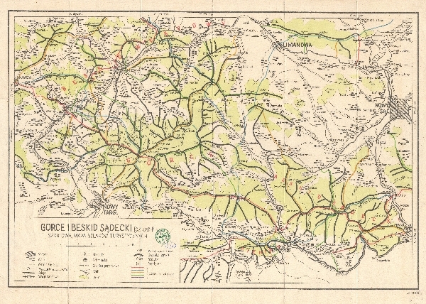 Mapa turystyczna, graniowa obejmująca Pieniny, Gorce i Beskid Sądecki w okolicy Nowego Sącza. W podkładzie sieć rzeczna i komunikacja. Zaznaczone lasy oraz skały i urwiska, szlaki turystyczne i schroniska.