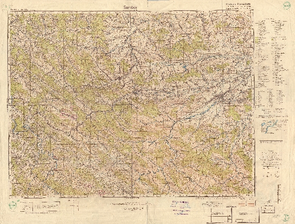 Mapa obejmująca obwód lwowski na zachód od Sambora. Rzeźba przedstawiona za pomocą poziomic i punktów wysokości. Sieć hydrograficzna. Zaznaczono obszary zalesione. Komunikacja - drogi, koleje. Osadnictwo. Objaśnienia w j. pol., niem.