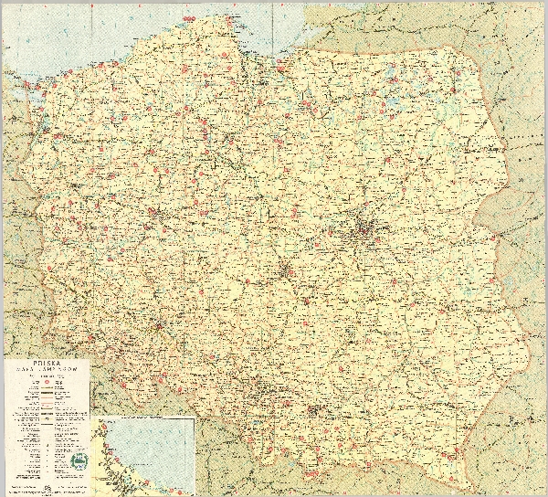 Przeglądowa mapa Polski z zaznaczonymi drogami różnej kategorii oraz siecią kolejową i nazwami miejscowości. Zaznaczono campingi i stacje benzynowe. W podkładzie sieć hydrograficzna. Dodatkowo mapka okolic Gdańska i Gdyni. Objaśnienia.