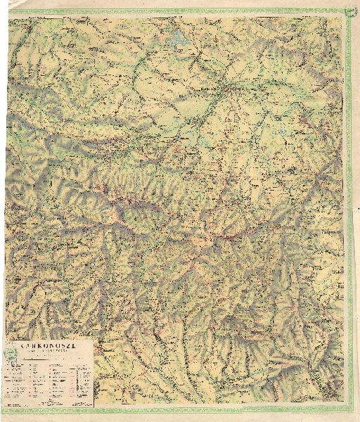 Mapa turystyczna Karkonoszy wykonana na podkładzie topograficznym. Rzeźba zaznaczona poziomicami i cieniowaniem. Zaznaczone punkty wysokości. Sieć hydrograficzna. Komunikacja - koleje i drogi. Osadnictwo. Zaznaczone szlaki turystyczne, obiekty turystyczne, zabytki, jaskinie. Objaśnienia.