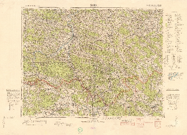 Mapa topograficzna obejmująca Pieniny i Beskid Sądecki. Rzeźba przedstawiona metodą poziomic, punkty wysokości. Zaznaczono tereny zalesione. Sieć hydrograficzna. Komunikacja - drogi i koleje. Osadnictwo. Siatka kilometrowa. Mapa jest kompilacją różnych typów map. Objaśnienia w j. pol. niem.