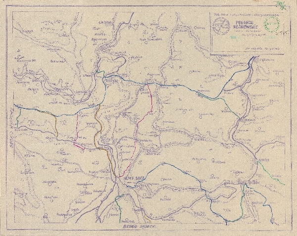 Szkic szlaków turystycznych w Beskidzie Sądeckim. W podkładzie sieć rzeczna, komunikacja - koleje i drogi, miejscowości. Podano wysokości niektórych szczytów.