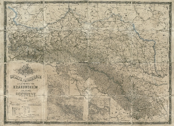 Mapa ścienna Galicji i Bukowiny. Rzeźba przedstawiona metodą kresek i punktami wysokości. Sieć hydrograficzna. Komunikacja - koleje, ważniejsze drogi. Nazwy miejscowości (7 klas wielkości). Zaznaczone uzdrowiska. Dodatkowo w większej skali mapa okolic Krakowa