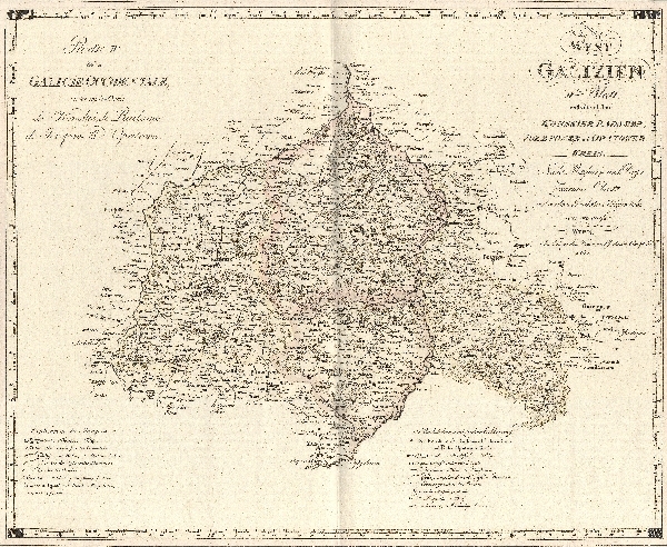 Przeglądowa mapa administracyjna Galicji. Rzeźba zaznaczona metodą kresek. Sieć rzeczna. Komunikacja - drogi. Nazwy miejscowości. Zaznaczone obszary zalesione oraz kopalnie i zakłady przetwórcze (huty) opisane w objaśnieniach. Granice polityczne i administracyjne kolorowane ręcznie. Mapa drukowana z miedziorytu.