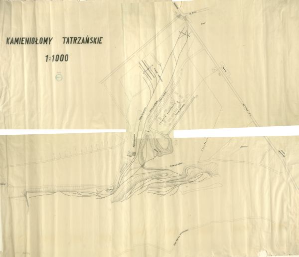 Plan kamieniołomów tatrzańskich wykonany w l. 1934 - 1936. Zaznaczone obszary eksploatacji kamienia, obiekty obróbki materiału skalnego, kolej wąskotorowa, osiedle robotnicze i inne obiekty przy drodze do Kuźnic.