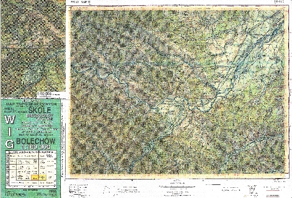 Reprodukcja kserograficzna mapy WIG z 1935 r. "Skole Pas 52 Słup 37." opracowanej w 1928 r. na podstawie mapy 1:75 000 z 1925 r. Powiększone fragmenty z miejscowością Skole i z okolicą Urycza. Okładka.