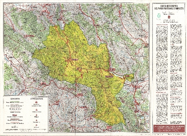 Mapa Parku Narodowego Abruzji, przedstawiona na podkładzie mapy topograficznej. Rzeźba przedstawiona poziomicami i rysunkiem skał, punkty wysokości. Sieć rzeczna. Komunikacja - drogi i koleje. Zaznaczone granice parku i strefy ochronnej. Naniesione centra informacyjne i campingi. Dodatkowo informacje o parku. Objaśnienia.