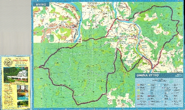 Plan Rytra i okolic. W podkładzie rzeźba zaznaczona poziomicami i punktami wysokości. Sieć rzeczna. Komunikacja - koleje i drogi. Zaznaczone obiekty użyteczności publicznej, zabytki. Informacje o obiektach turystycznych. Dodatkowo powiększony plan centrum Rytra. Objaśnienia.