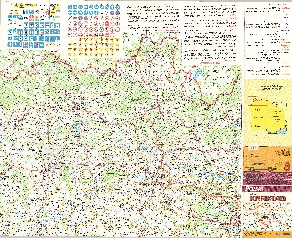 Mapa samochodowa obejmująca obszar Małopolski. Zaznaczona sieć hydrograficzna i obszary zalesione. Komunikacja - koleje i 8 kategorii dróg. Osadnictwo. Poza mapą objaśnienia i znaki drogowe. Karta tytułowa.