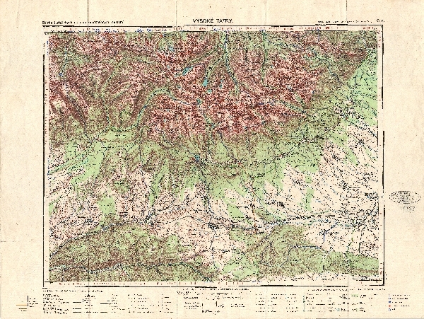 Mapa turystyczna obejmująca Tatry Wysokie, Tatry Bielskie i część Tatr Zachodnich po Dolinę Kościeliską. Wykonana na podkładzie topograficznej mapy wojskowej. Rzeźba poziomicowo - kreskowa. W obszarze wysokogórskim rysunek skał i kolor brązowy. Naniesiona treść turystyczna - drogi, szlaki turystyczne, schroniska. Poza ramką objaśnienia znaków.