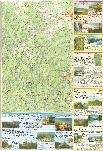 Turystyczna mapa Gorganów, wykonana na podkładzie mapy topograficznej. Rzeźba przedstawiona metodą poziomic i cieniowania, punkty wysokościowe. Sieć hydrograficzna. Zaznaczono obszary zalesione. Komunikacja - drogi i koleje, wyciągi narciarskie. Osadnictwo. Zaznaczono szlaki turystyczne, zabytki, obiekty turystyczne, użyteczności publicznej. Informacje ogólne, ochrona przyrody, turystyka Polska w Gorganach, propozycje wycieczek. 21 zdjęć.