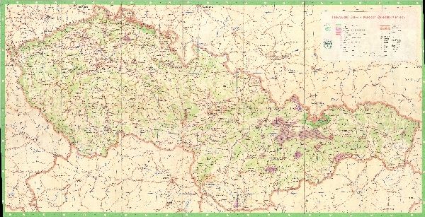 Mapa Czechosłowacji z obszarami chronionymi. różnej kategorii. W podkładzie sieć rzeczna, komunikacja - koleje i drogi, nazwy miejscowości. Zaznaczone obszary zalesione, granice państwowe i administracyjne, granice parków narodowych, HKO, rezerwatów przyrody oraz inne obiekty podlegające ochronie. Objaśnienia.
