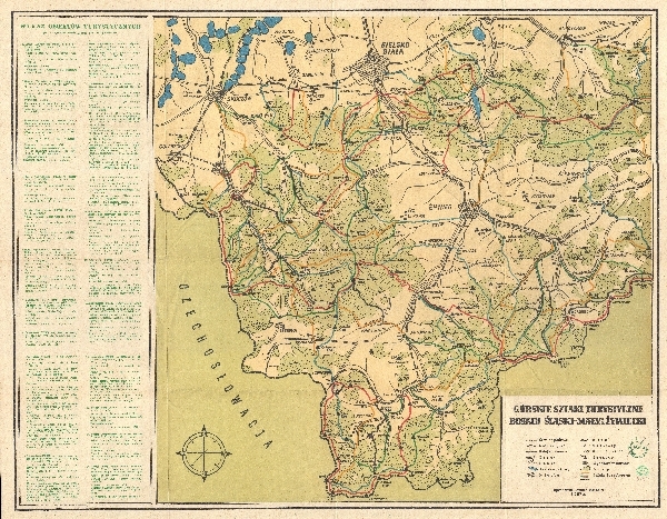 Mapa turystyczna Beskidu Śląskiego i Żywieckiego. Zaznaczona sieć hydrograficzna i obszary leśne. Sieć komunikacyjna - koleje i drogi. Osadnictwo. Podane wysokości szczytów. Zaznaczone szlaki turystyczne i schroniska. Obok opis obiektów turystycznych. Legenda.