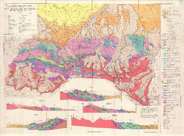 Mapa geologiczna Tatr Polskich, zakryta. Wykonana na podkładzie mapy turystycznej w skali 1:30 000. Zaznaczono skały różnego wieku, jednostki geologiczne a także informacja o tektonice terenu. Naniesiona sieć hydrograficzna. Pod mapą 5. przekroi geologicznych.