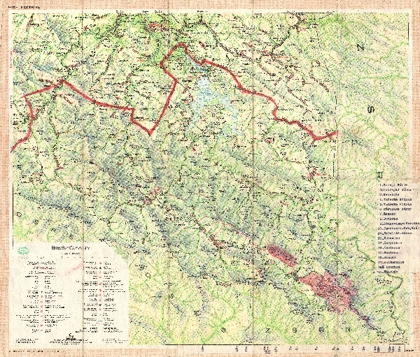 Mapa Bieszczad. Rzeźba zaznaczona przy pomocy poziomic i cieniowania, punkty wysokościowe. Zaznaczono obszary zalesione. Komunikacja - koleje i drogi. Osadnictwo. Zaznaczone szlaki turystyczne, tereny narciarskie, obiekty turystyczne, zabytki, rezerwaty przyrody. Odręcznie zaznaczone granice obszaru chronionego i polany, na których wypasano owce z TPN. Dodatkowo zestawione nazwy polan. Objaśnienia.