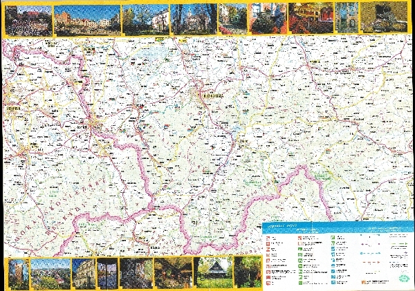 Mapa turystyczna Euroregionu Śląsk Cieszyński i Euroregionu Beskidy. Sieć hydrograficzna. Komunikacja - drogi i koleje. Osadnictwo. Zaznaczono punkty wysokości, granice państwowe, szlaki turystyczne. Przy nazwach miejscowości naniesiono oznakowanie atrakcji turystycznych. Objaśnienia. 17. fotografii.