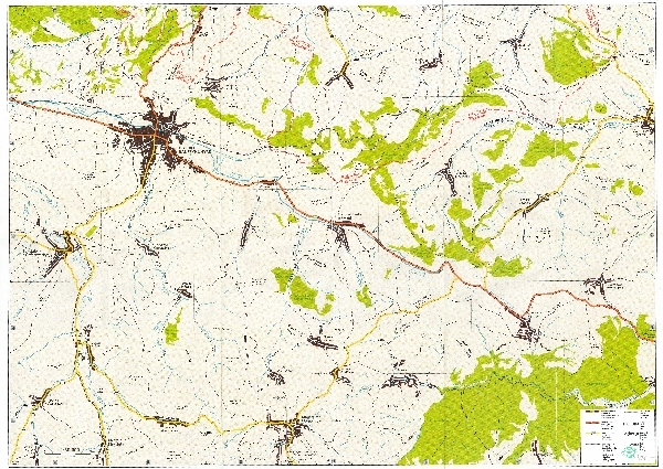 Mapa turystyczna okrêgu Klu¿. Zaznaczona sieæ rzeczna, obszary zalesione, komunikacja - drogi i koleje, osadnictwo. Obja¶nienia.