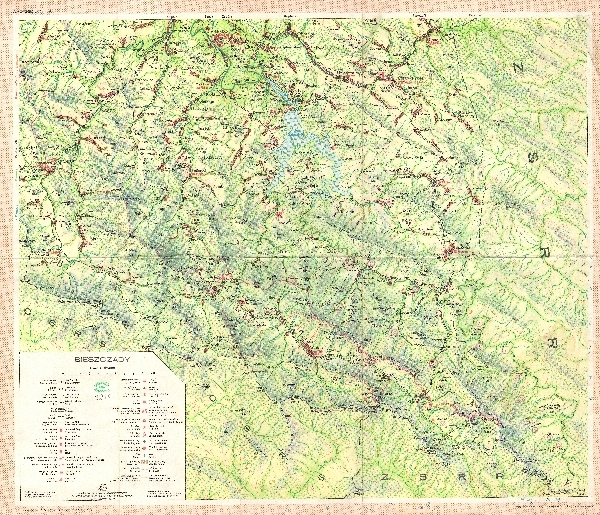Mapa Bieszczad. Rzeźba zaznaczona przy pomocy poziomic i cieniowania, punkty wysokościowe. Zaznaczono obszary zalesione. Komunikacja - koleje i drogi. Osadnictwo. Zaznaczone szlaki turystyczne, tereny narciarskie, obiekty turystyczne, zabytki, rezerwaty przyrody. Odręcznie zaznaczono 19. polan, których nazwy i powierzchnie opisano na odwrocie. Objaśnienia.