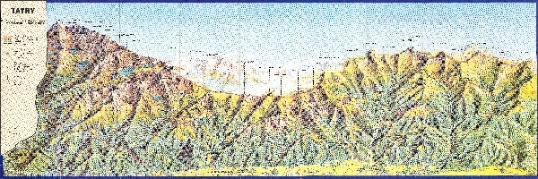 Widok panoramiczny na Tatry od północy, od Rysów po Wołowiec. Opisane ważniejsze szczyty z podaniem wysokości i nazwy dolin. Zaznaczono szlaki turystyczne i schroniska, większe jaskinie. Objaśnienia w j. ang.