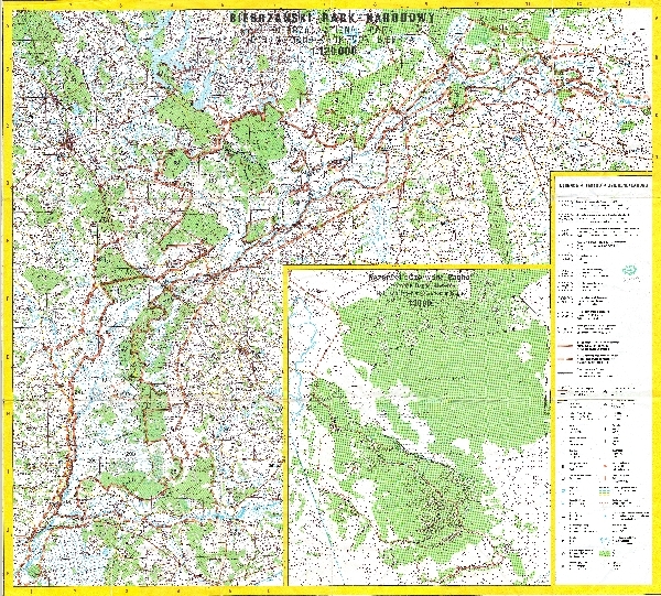 Szczegółowa mapa Biebrzańskiego Parku Narodowego wykonana na podkładzie topograficznym. Zaznaczone poziomice i punkty wysokości. Sieć hydrograficzna. Komunikacja - koleje i drogi. Osadnictwo. Zaznaczone granice parku narodowego i rezerwatów ścisłych. Zaznaczono szlaki turystyczne, szlaki kajakowe, punkty widokowe, zabytki, obiekty użyteczności publicznej i turystyczne oraz zbiorowiska roślinne i obszary przekształcone antropogenicznie. Dodatkowo mapa rezerwatu "Czerwone Bagno" w skali 1:30 000. Objaśnienia w j. pol., ang. i niem.