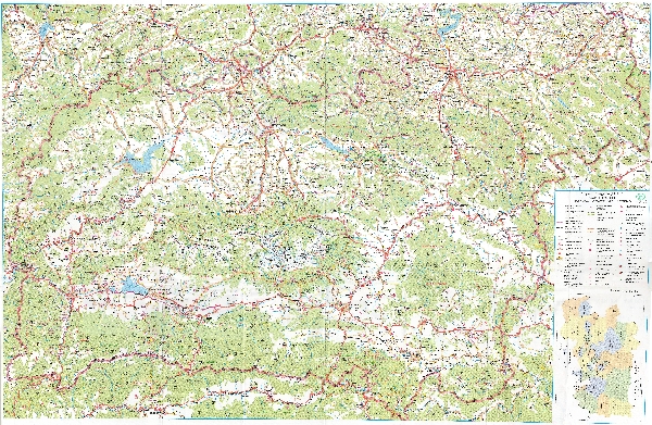 Mapa Euroregionu Tatry. Zaznaczono punkty wysokościowe, w Tatrach uproszczony rysunek skał. Sieć hydrograficzna. Zaznaczono obszary zalesione. Komunikacja - koleje, drogi, koleje linowe. Osadnictwo. Zaznaczono granice państwa, granice administracyjne, granice Euroregionu, parku narodowego i parków krajobrazowych. Zaznaczono rezerwaty przyrodnicze, szlaki turystyczne, obiekty turystyczne, zabytki, obiekty użyteczności publicznej. Objaśnienia w j. pol., słow., ang. Dodatkowo mapa administracyjna Euroregionu Tatry na dzień 31.12.2004 r.