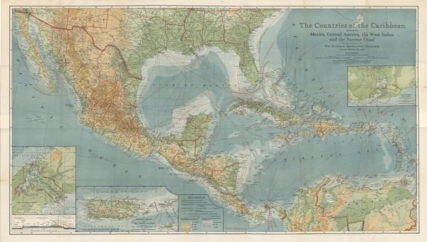 Przeglądowa mapa Ameryki Środkowej. Rzeźba zaznaczona barwami. Sieć hydrograficzna. Komunikacja - koleje i drogi. Nazwy miejscowości. Zaznaczono granice polityczne i administracyjne, trasy kursowania promów. Dodatkowo mapa obszaru Guantanamo, Kanału Panamskiego i Porto Rico. Przekrój przez Kanał Panamski z zaporami i grodziami. Objaśnienia.
