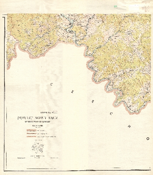 Arkusz tytułowy. Mapa topograficzna powiatu Nowy Sącz obejmująca rejon Piwnicznej. Rzeźba przedstawiona przy pomocy poziomic i punktów wysokości. Sieć hydrograficzna. Zaznaczono obszary zalesione. Komunikacja - drogi i koleje. Osadnictwo. Zaznaczono granice administracyjne.
