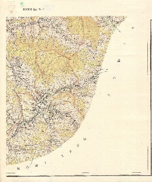 Mapa topograficzna powiatu Myślenice obejmująca rejon Rabki. Rzeźba przedstawiona przy pomocy poziomic i punktów wysokości. Sieć hydrograficzna. Zaznaczono obszary zalesione. Komunikacja - drogi i koleje. Osadnictwo. Zaznaczono granice administracyjne.