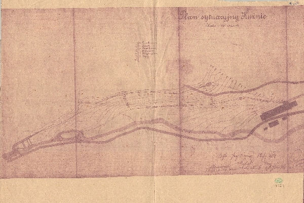 Odbitka planu sytuacyjnego Kuźnic z zaznaczonymi obiektami przemysłowymi. W podkładzie zaznaczono poziomice, potoki i drogi.