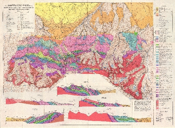 Mapa geologiczna Tatr Polskich, zakryta. Wykonana na podkładzie mapy turystycznej w skali 1:30 000. Zaznaczono skały różnego wieku, jednostki geologiczne a także informacja o tektonice terenu. Naniesiona sieć hydrograficzna. Pod mapą 5. przekroi geologicznych.
