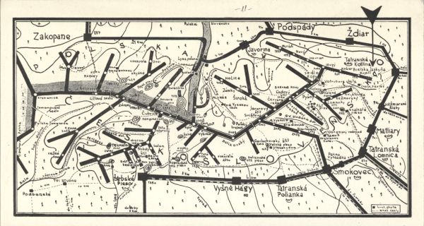 Mapa połączeń komunikacyjnych na Podtatrzu. Zaznaczone główne granie Tatr i szczyty, ważniejsze rzeki. Komunikacja - drogi i koleje. Nazwy miejscowości.
