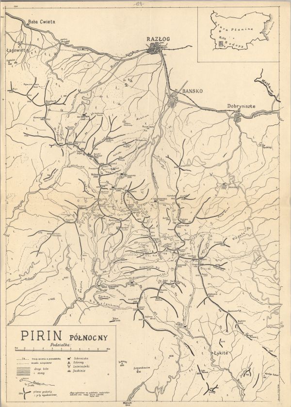 Mapa graniowa Pirinu. Zaznaczone ważniejsze szczyty z podaniem wysokości. Sieć rzeczna. Komunikacja - koleje i drogi. Zaznaczono szlaki turystyczne. Objaśnienia.