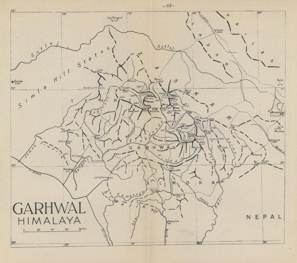 Przeglądowa mapa Garhwal Himalaya. Zaznaczone granie i ważniejsze szczyty z podaniem wysokości. Sieć rzeczna. Komunikacja - drogi. Nazwy miejscowości.