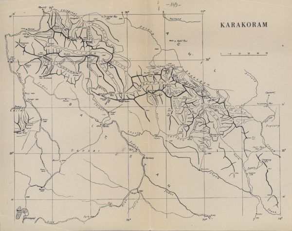 Przeglądowa mapa Karakorum. Zaznaczone granie i ważniejsze szczyty z podaniem wysokości. Sieć rzeczna, jeziora i lodowce. Komunikacja - drogi. Nazwy miejscowości.