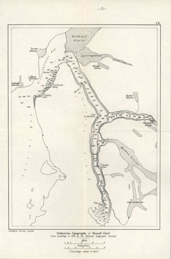 Mapa geologiczna wybrzeża nad Zatoką Alaska sporządzona w trakcie wyprawy naukowej. Zaznaczone pomiary batymetryczne Fiordu Russella.