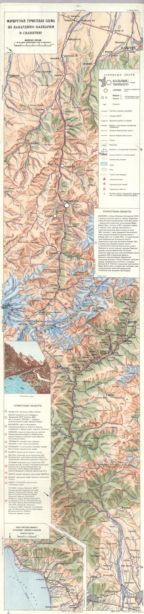Przeglądowa mapa fragmentu Kaukazu. Rzeźba zaznaczona metodą cieniowania, rysunek skał. Zaznaczona sieć rzeczna, lodowce, obszary zalesione, komunikacja - drogi i kolej, ścieżki, nazwy miejscowości, trasy turystyczne, obiekty turystyczne i bazy noclegowe. Objaśnienia. Dodatkowo mapa fragmentu wybrzeża Morza Czarnego w rejonie Suhui w skali 1:600 000.