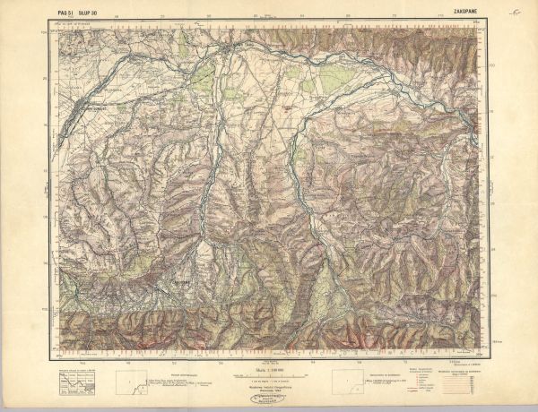 Mapa topograficzna obejmująca Orawę. Zaznaczono punkty wysokości, sieć hydrograficzna, komunikacja - koleje i drogi, osadnictwo, szlaki turystyczne, granica państwowa. Poza ramką objaśnienia.
