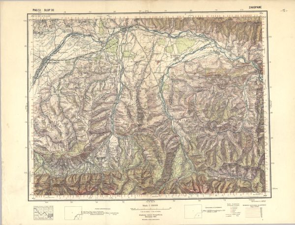 Mapa topograficzna obejmująca Orawę. Zaznaczono punkty wysokości, sieć hydrograficzna, komunikacja - koleje i drogi, osadnictwo, szlaki turystyczne, granica państwowa. Poza ramką objaśnienia.