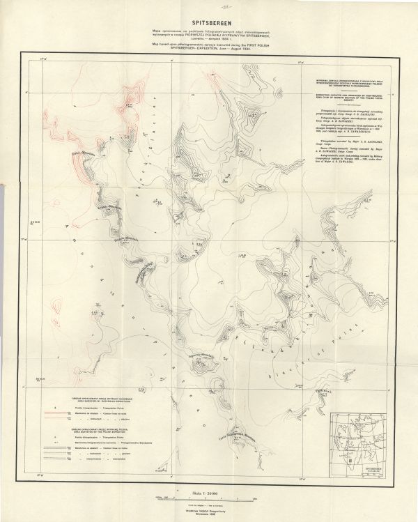 Mapa południowej części Spitsbergenu opracowana w czasie Pierwszej Polskiej Wyprawy na Spitsbergen w 1934 r. Zawiera rysunek poziomicowy i punkty wysokości. Objaśnienia. Dodatkowo mapa ukazująca lokalizację arkusza.