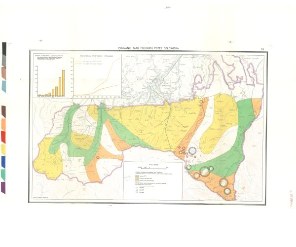 Mapa rozwoju poznania naukowego Tatr Polskich. Na podkładzie poziomicowym zaznaczono obszary opisywane przez pierwszych badaczy - w wersji roboczej przedstawiono tylko obszary opisywane przez Ludwika Zejsznera, Stanisława Staszica i Hucketa. Dodatkowo wykresy rozwoju poznania turystycznego i taternickiego w latach 1860 - 1970 i rozwoju tatrzańskich badań naukowych. Objaśnienia.