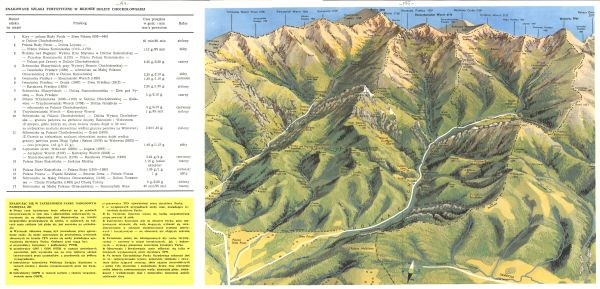 Widok na Tatry od Tomanowego Wierchu po Rohacz Ostry. Zaznaczona rzeźba terenu, potoki, drogi, koleje linowe, szlaki turystyczne, obiekty użyteczności publicznej i obiekty turystyczne. Podano nazwy ważniejszych szczytów i przełęczy z wysokościami oraz inne nazwy topograficzne. Dalszy ciąg opisu z odwrocia (zestawienie znakowanych szlaków turystycznych w rejonie Doliny Chochołowskiej). Przepisy obowiązujące w TPN.