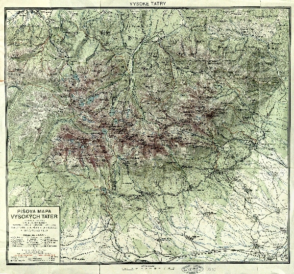 Mapa turystyczna obejmująca Tatry Wysokie oraz Tatry Bielskie i część Tatr Zachodnich po Giewont. Rzeźba przedstwiona przy pomocy poziomic i cieniowania. W obszarach wysokogórskich rysunek skał. Sieć hydrograficzna. Zaznaczone lasy, naniesione drogi i szlaki turystyczne.