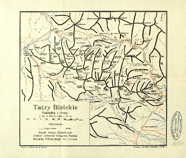 Mapa graniowa obejmująca Tatry Bielskie. Zaznaczone granie, ważniejsze szczyty, sieć rzeczna, jeziora. Drogi i szlaki turystyczne.