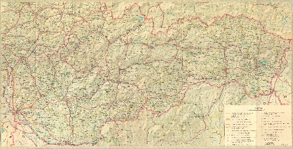 Mapa samochodowa Słowacji. Rzeźba zaznaczona metodą cieniowania. Sieć hydrograficzna. Sieć komunikacyjna - drogi, koleje. Zaznaczone osadnictwo, ważniejsze obiekty turystyczne.
