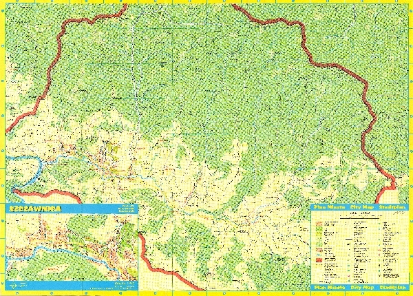 Mapa obejmująca obszar Szczawnicy i Beskidu Sądeckiego. Rzeźba przedstawiona metodą poziomic. Sieć hydrograficzna, obszary zalesione, sieć drogowa i osadnictwo. Zaznaczone szlaki turystyczne i obiekty turystyczne oraz ważniejsze obiekty użyteczności publicznej. Dodatkowo plan centrum Szczawnicy (20x13 cm). Legenda.