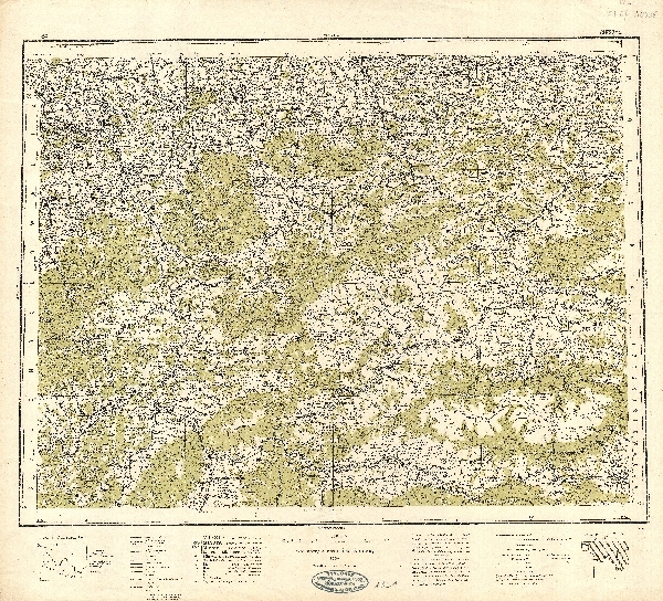 Mapa operacyjna obejmująca Cieszyn i tereny na wschód po Pieniny i Tatry. Punkty wysokości. Zaznaczone obszary leśne. Sieć hydrograficzna. Komunikacja - koleje i drogi. Osadnictwo. Granice administracyjne i polityczne. Tatry przedstawione jako "biała plama" otoczona lasami. Pod mapą objaśnienia znaków topograficznych.
